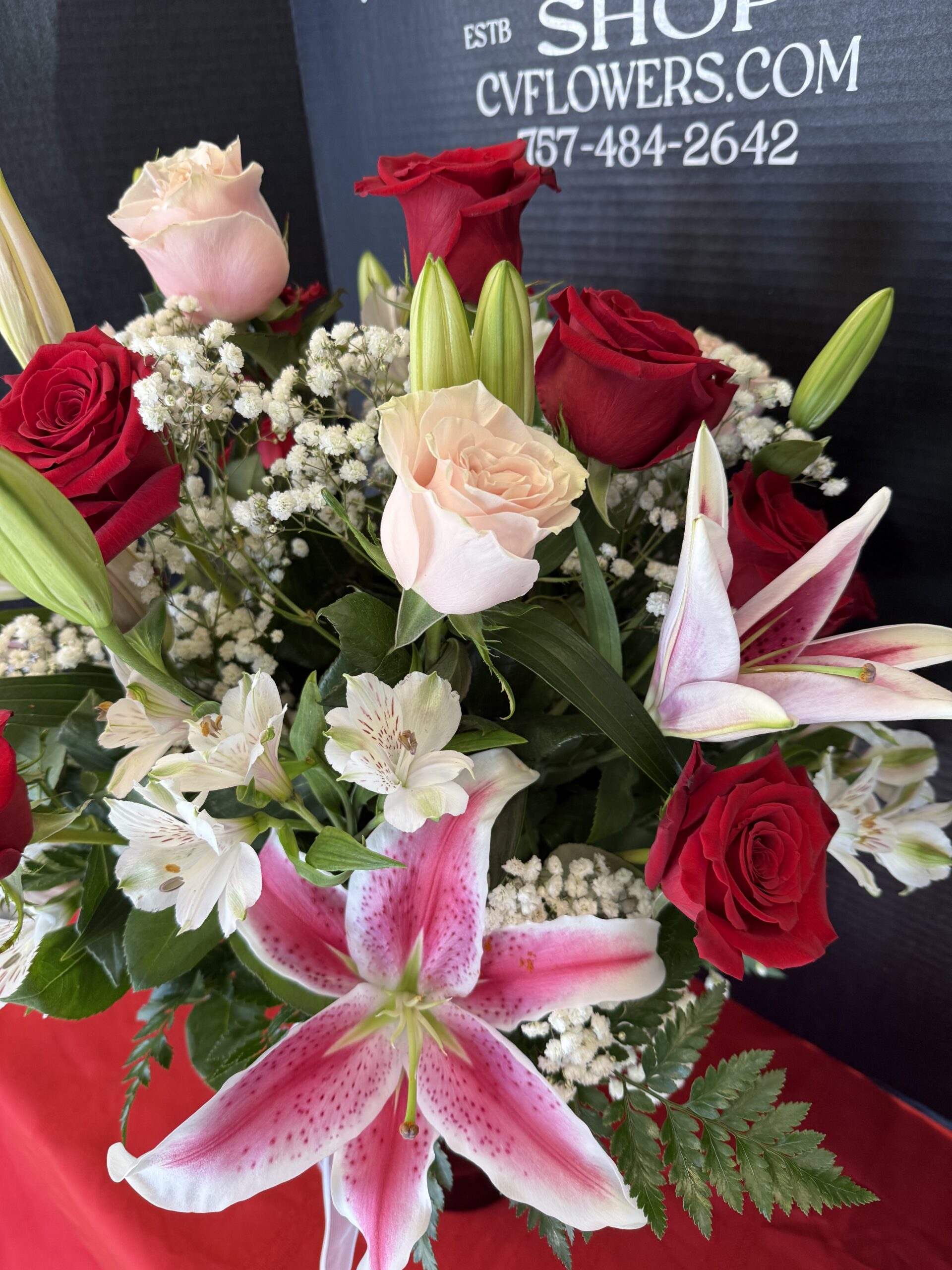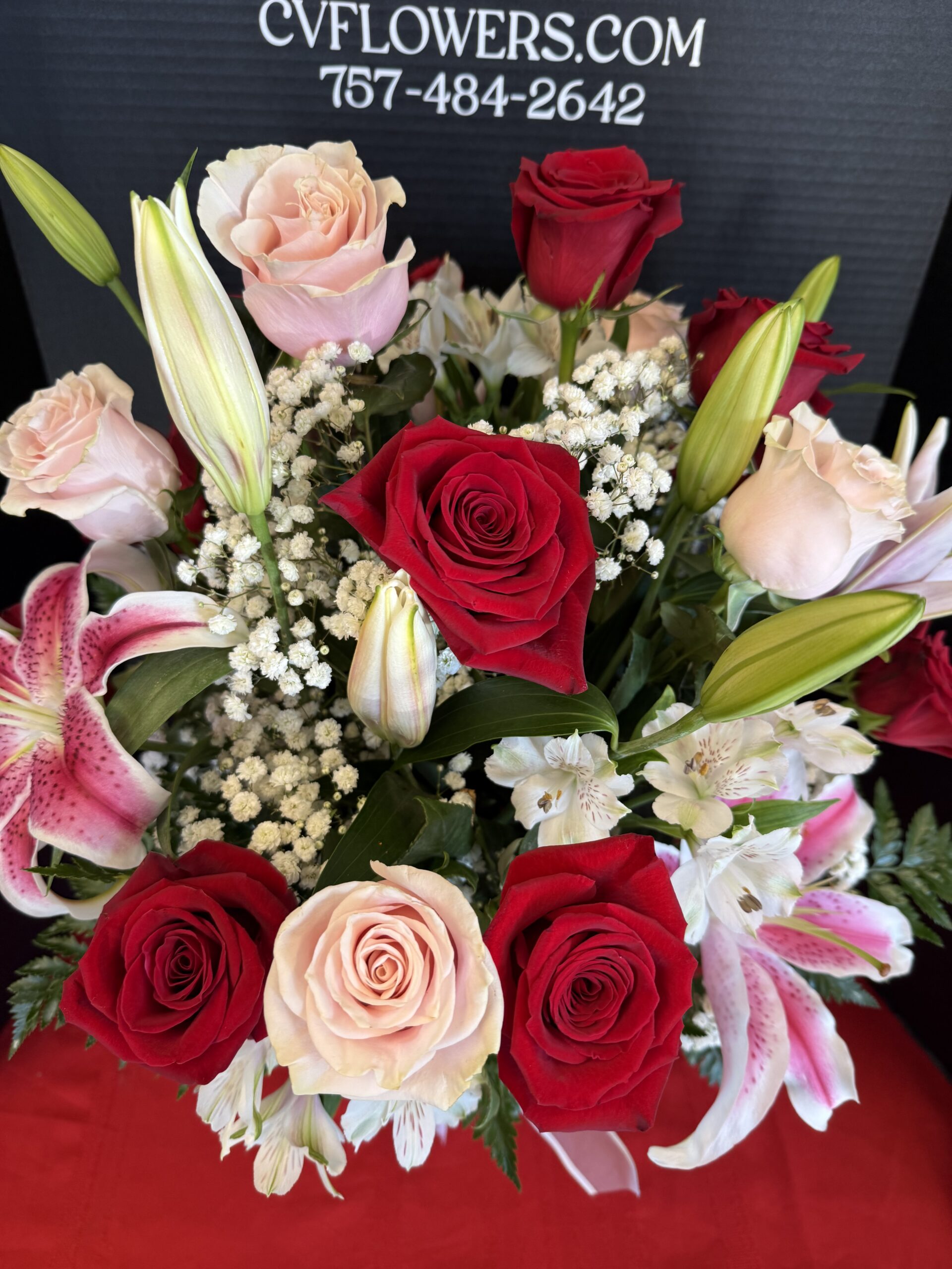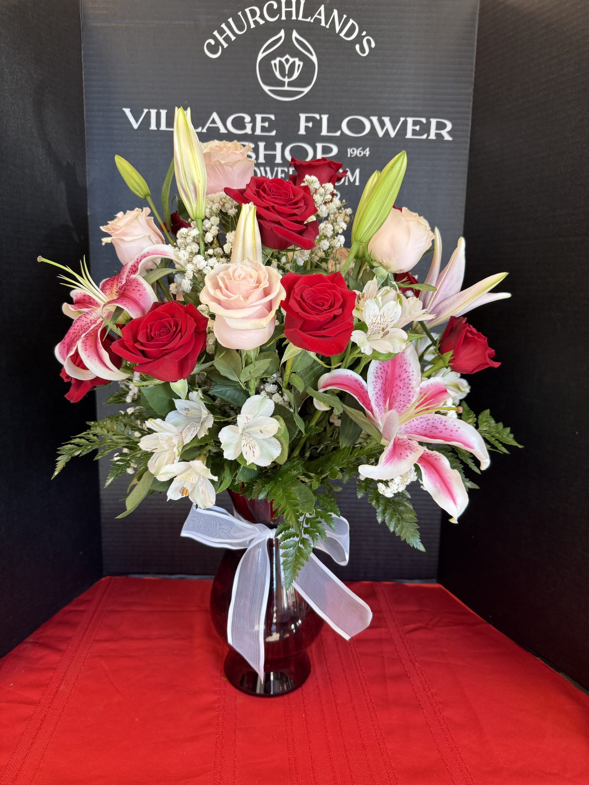 A lush Valentine’s arrangement featuring red and pink roses, Starfighter lilies, and white alstroemeria designed in a red glass vase.