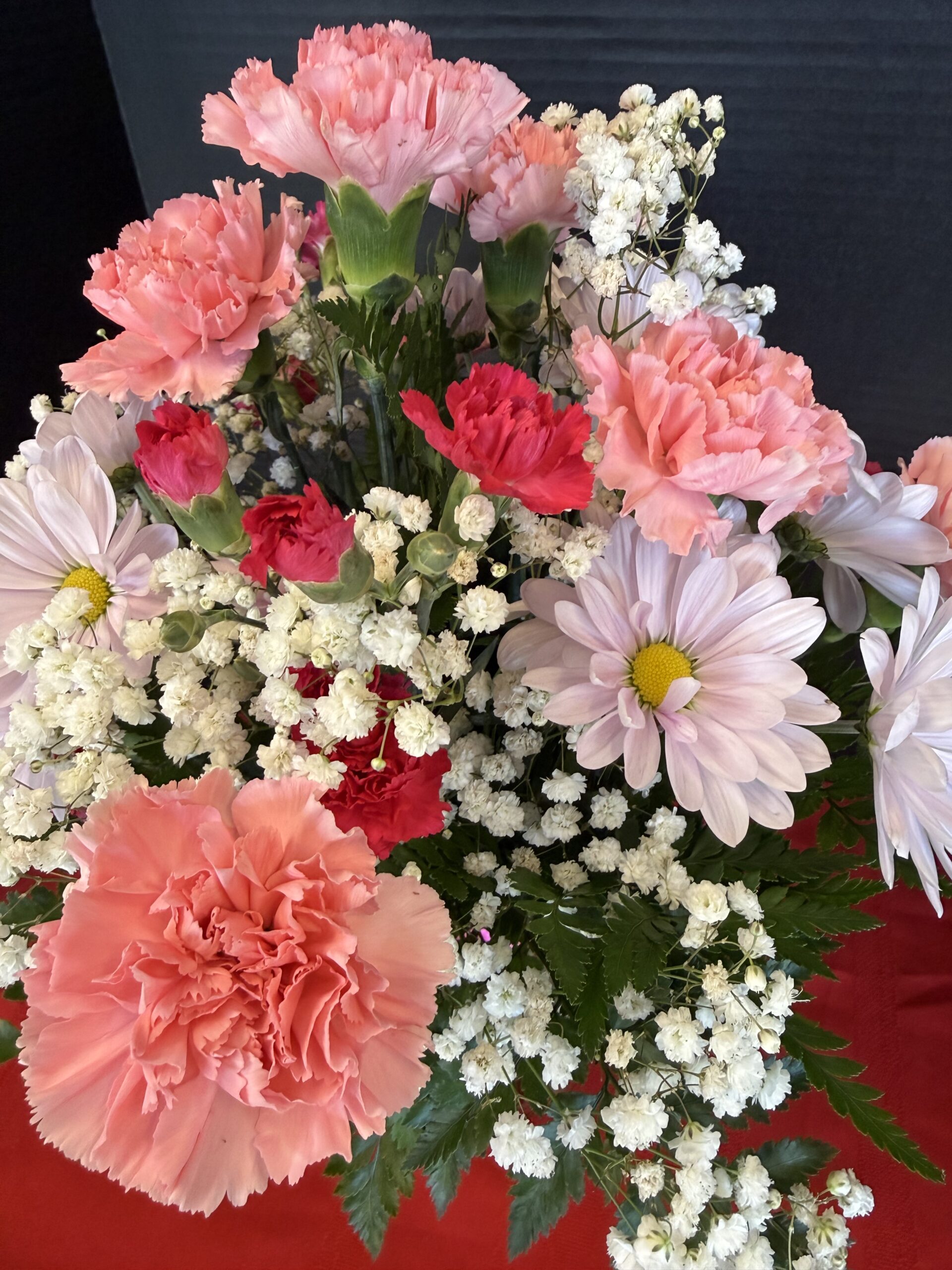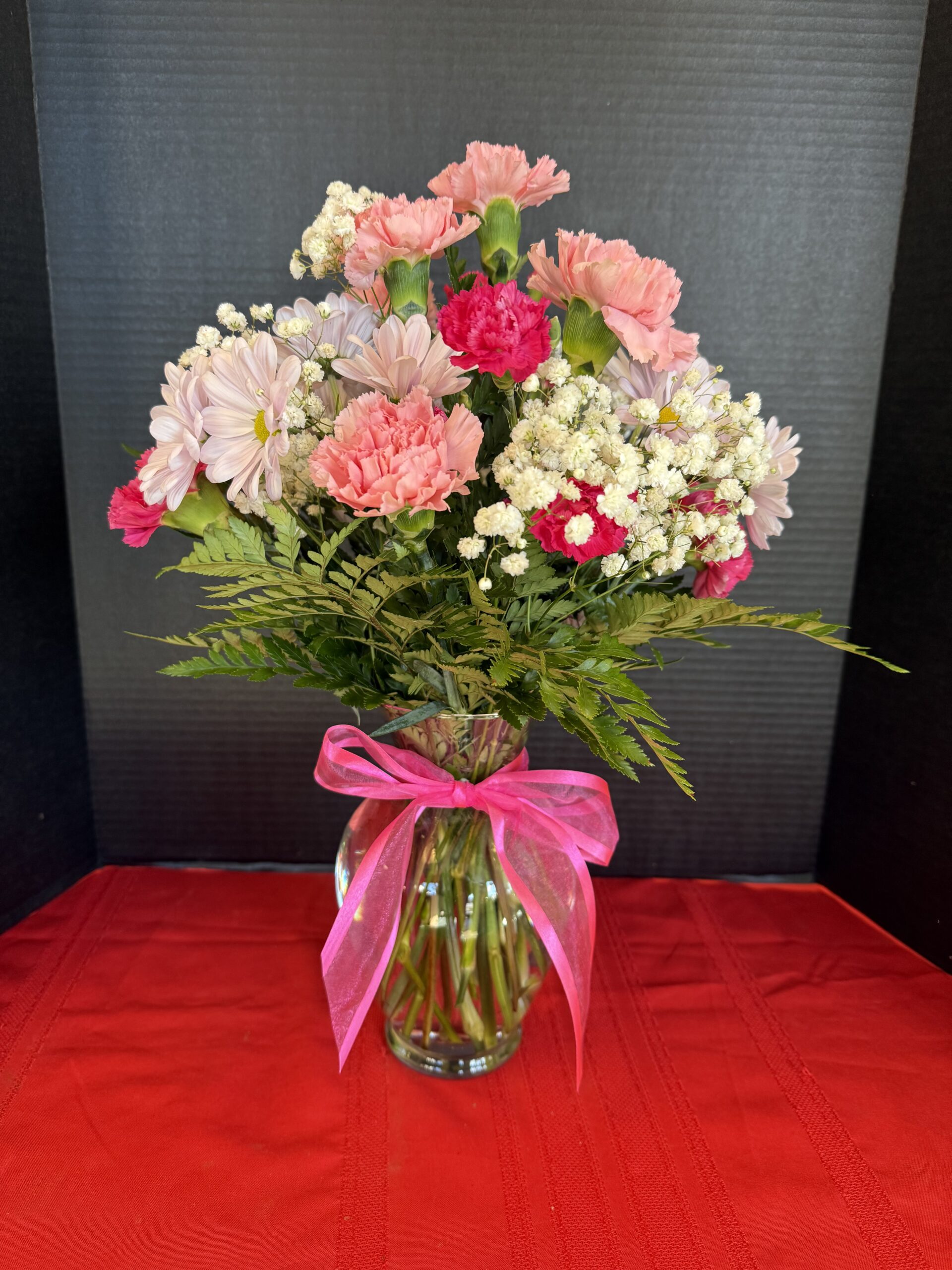 Pretty in Pink is a sweet and cheerful arrangement that proves simple can still be stunning. Soft pink carnations set a romantic tone, while lavender daisies add a touch of charm and lighthearted beauty. Hot pink pixie carnations bring a playful pop of color, creating a look that feels fresh, loving, and full of heart.