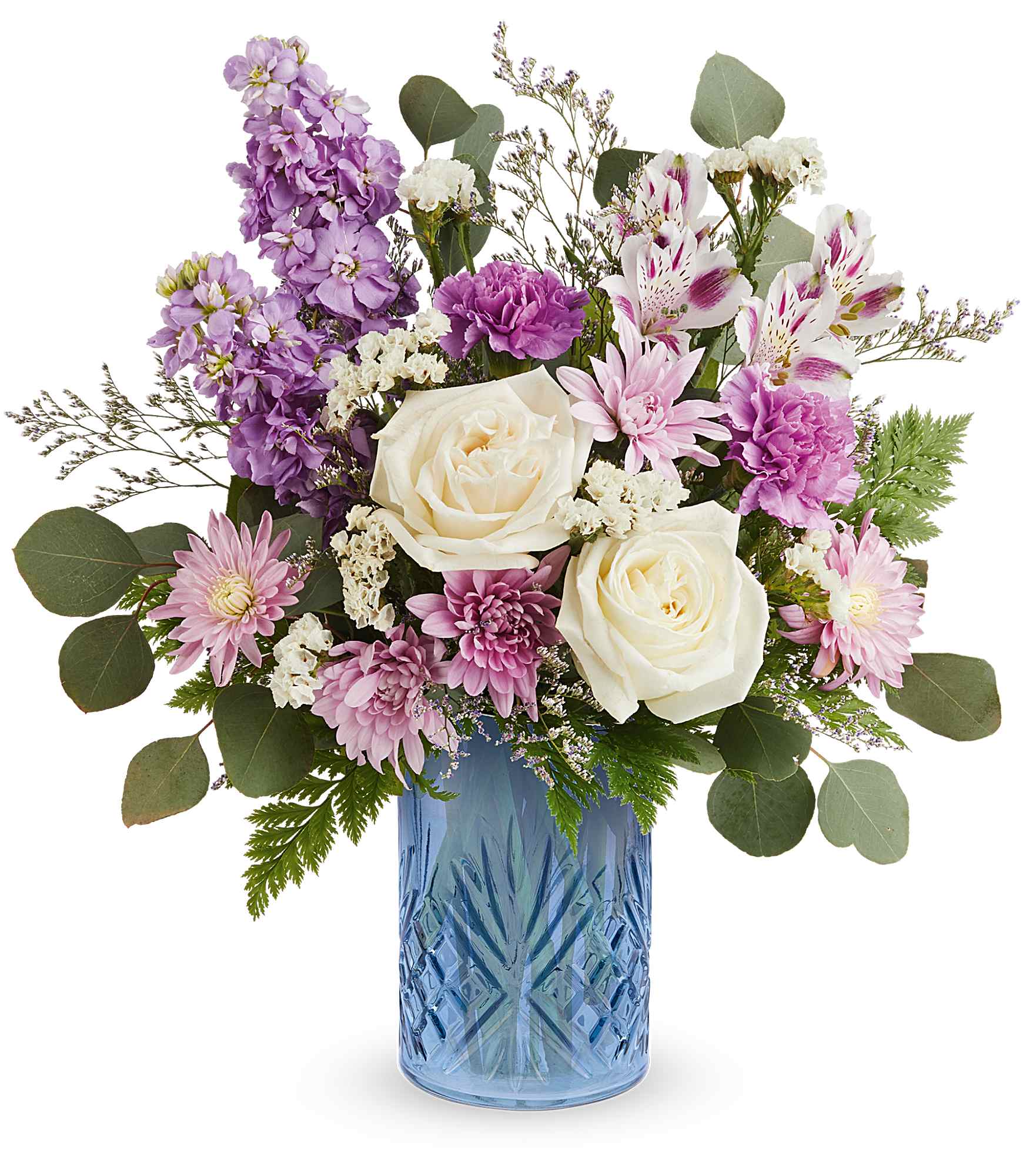 Teleflora’s Blue Bliss Bouquet is a graceful flower arrangement featuring white roses, lavender alstroemeria and stock, purple carnations, lavender cushion spray chrysanthemums, purple sinuata statice, and misty blue limonium, accented with silver dollar eucalyptus and Cleopatra leatherleaf fern, delivered in Teleflora’s Blue Belle Vase. Approximately 15 1/4″ W x 16 1/2″ H