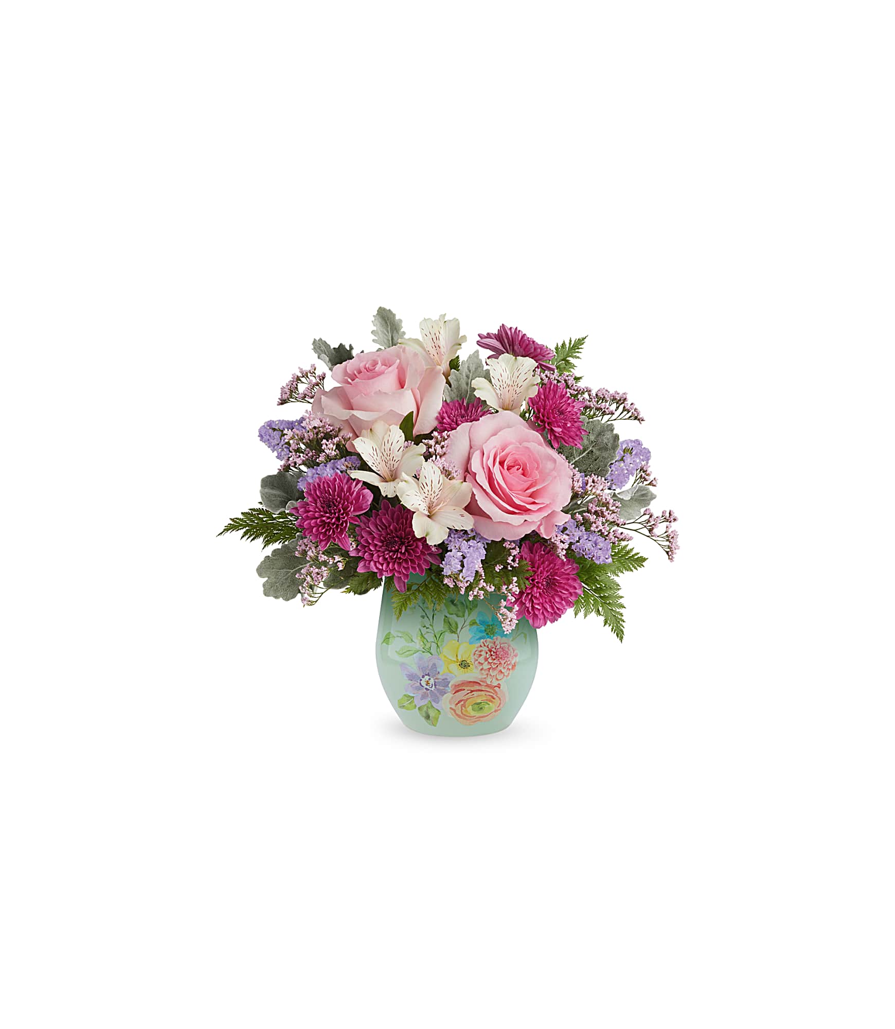 Teleflora’s Dream in Bloom Bouquet is a beautiful floral arrangement featuring pink roses, ivory alstroemeria, purple cushion spray chrysanthemums, lavender sinuata statice, and pink limonium, accented with dusty miller and leatherleaf fern, delivered in Teleflora’s Watercolor Garden Vase. Approximately 14″ W x 12 1/2″ H