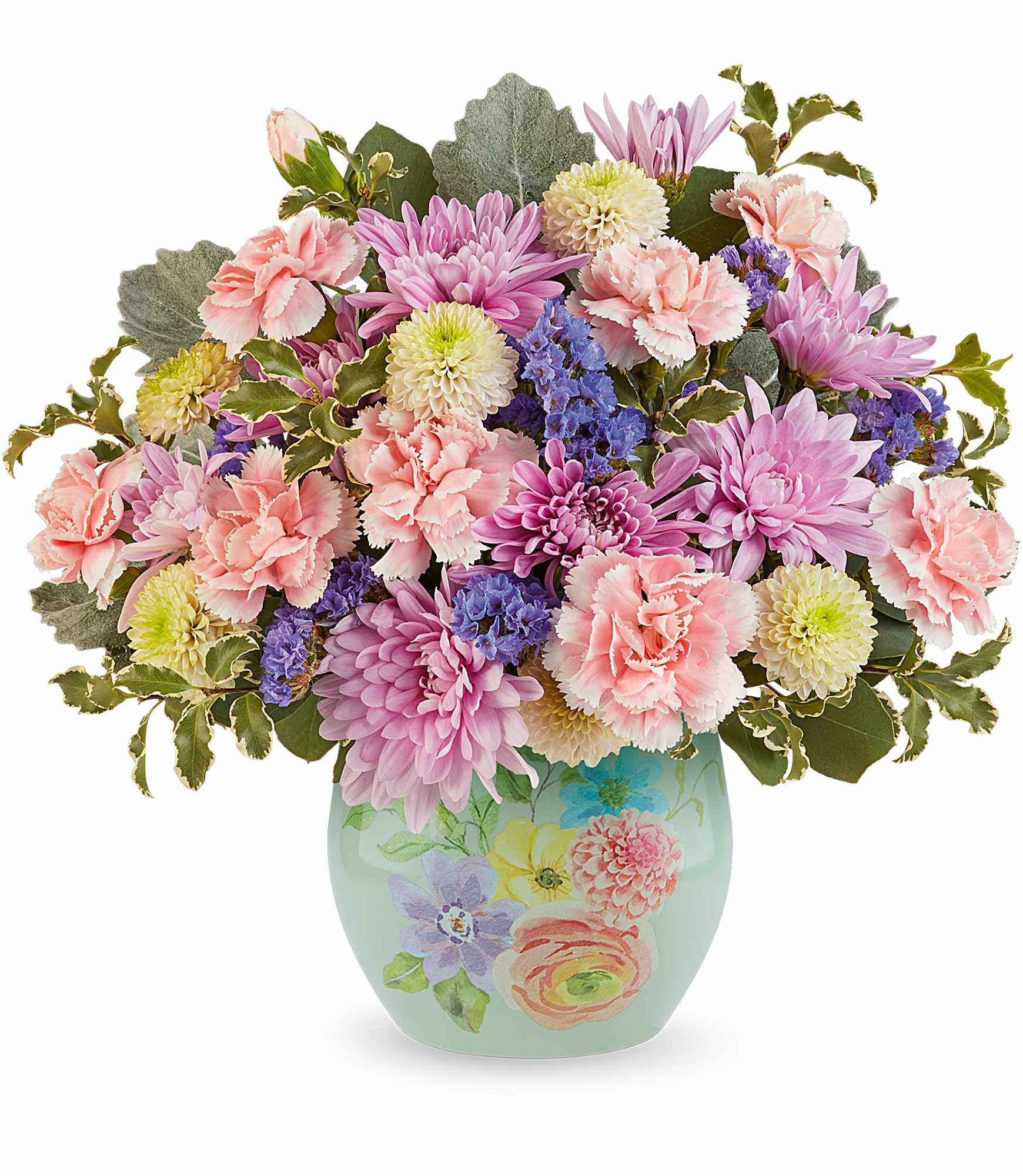 Teleflora’s Pretty in Pastels Bouquet is a sweet floral arrangement featuring roses, miniature pink carnations, white button spray chrysanthemums, lavender cushion spray chrysanthemums, and purple sinuata statice, accented with silver dollar eucalyptus, dusty miller, and pitta negra, delivered in Teleflora’s Watercolor Garden Vase. Approximately 11 3/4″ W x 11″ H