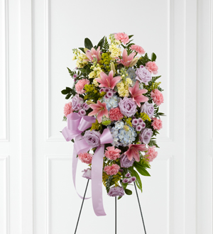 The FTD® Blessings of the Earth™ Easel is a soft and serene arrangement that elegantly honors the life of the deceased. Lavender roses, pink carnations, pink Asiatic lilies, blue hydrangea, yellow stock, lavender button poms, solidago and lush greens are beautifully accented with a lavender satin ribbon and displayed on a wire easel to create a gorgeous display for their memorial service.