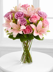 The FTD® Farewell Too Soon™ Bouquet is a blushingly beautiful way to convey your deepest sympathies for their loss. Pink and lavender roses are offset by pink Asiatic lilies, solidago and lush greens, perfectly arranged in a clear glass vase, to offer warmth and comfort to those facing the loss of their loved one.